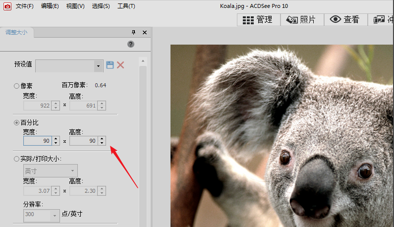 4、在acdsee调整图片大小中还可以按照百分比来调整图片的大小,这个和电脑自带的画图工具比较像。