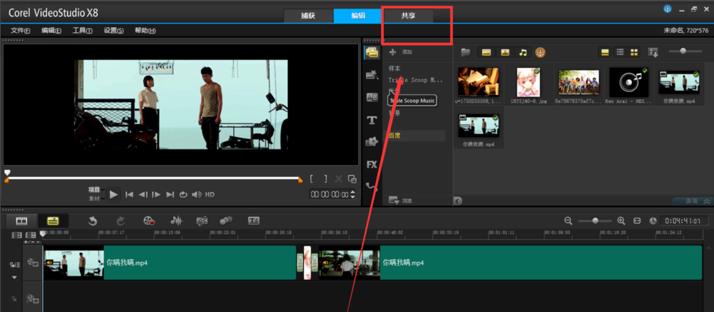 2、我们在会声会影界面顶部看到有个“共享”,如图所示,我们点击它,