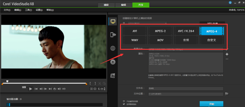 3、右边上方是用来让我们选择视频格式的,一般我们都是选mpeg4或者avi,
