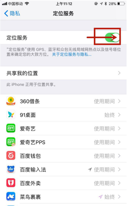 然后关闭“定位服务”开关就可以了。