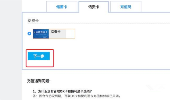 4、然后在话费卡的充值项下,点击‘下一步’按钮。