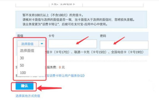 5、在该页面,选择好面值,输入卡号、卡密码,点击下方的‘确认’按钮就行了。