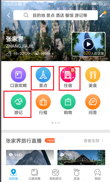 3、进去旅游攻略的主界面,可以看到景区、酒店、游记、美食等,如下图所示: