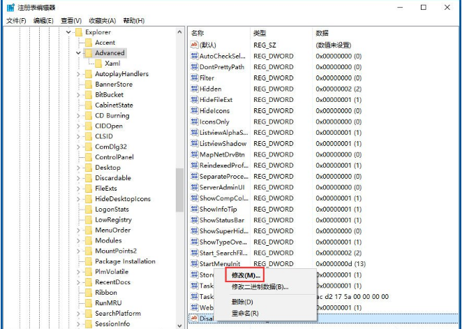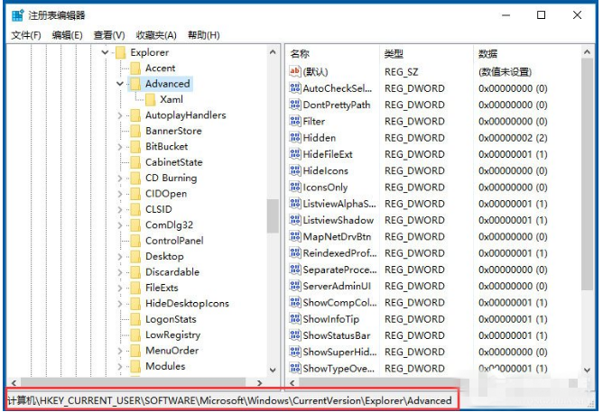 3、注册表找到HKEY_CURRENT_USER\\Software\\Microsoft\\Windows\\CurrentVersion\\Explorer\\Advanced;