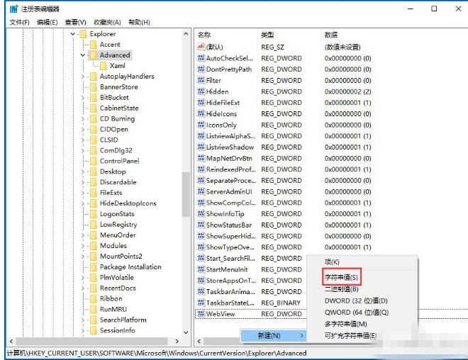 4、在注册表的Advanced列表下,点击鼠标右键,新建--字符串值;