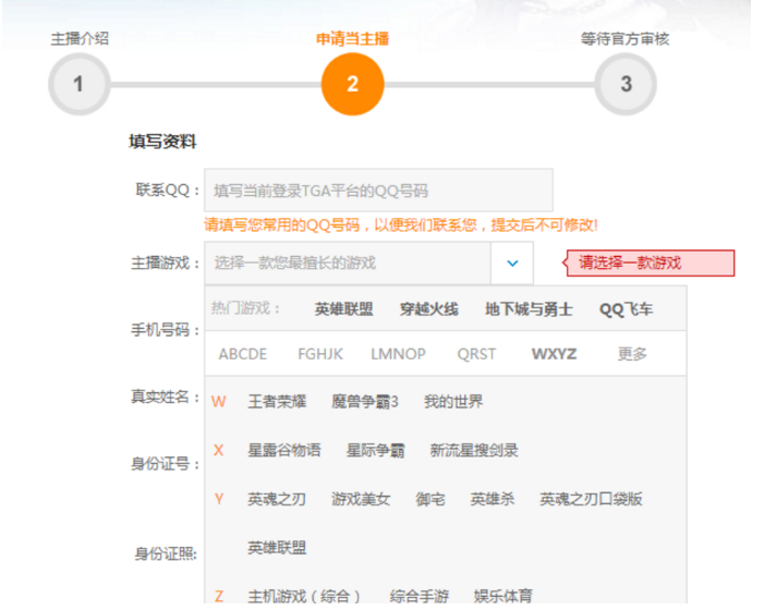 4、点击申请当主播之后,完善信息,并选择一款你擅长的游戏。