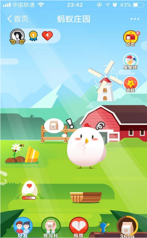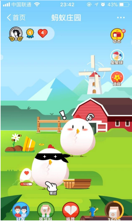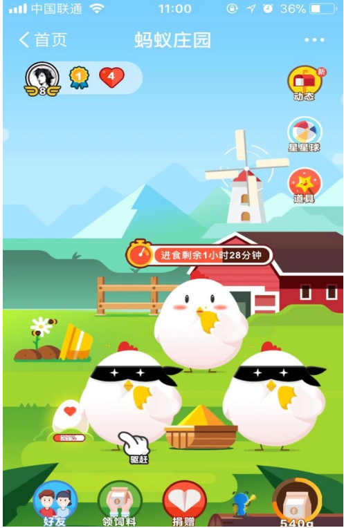 打开“蚂蚁庄园”,如果遇到偷吃的小鸡,只需要点击“驱赶”就能赶跑它。