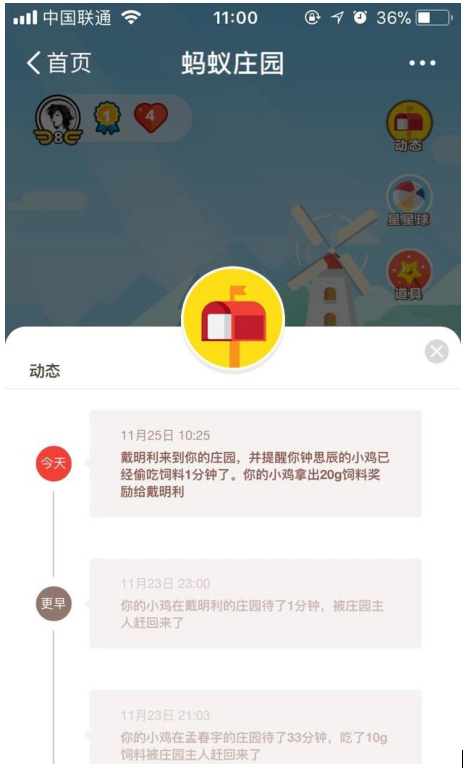 点击“动态”,可以十分详细的对小鸡的活动情况进行掌握,方便做出决策。