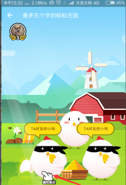 3、好友列表后带有这个小鸡的图标,说明他的庄园有其他好友的小鸡在偷吃,点击一下头像就可以调转到这个好友的庄园。