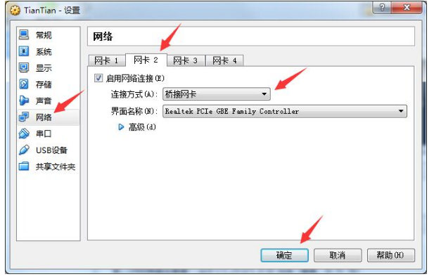 5、接着在左侧选择“网络”并打开网卡2,然后将连接方式,改为桥接网卡,点击确定;