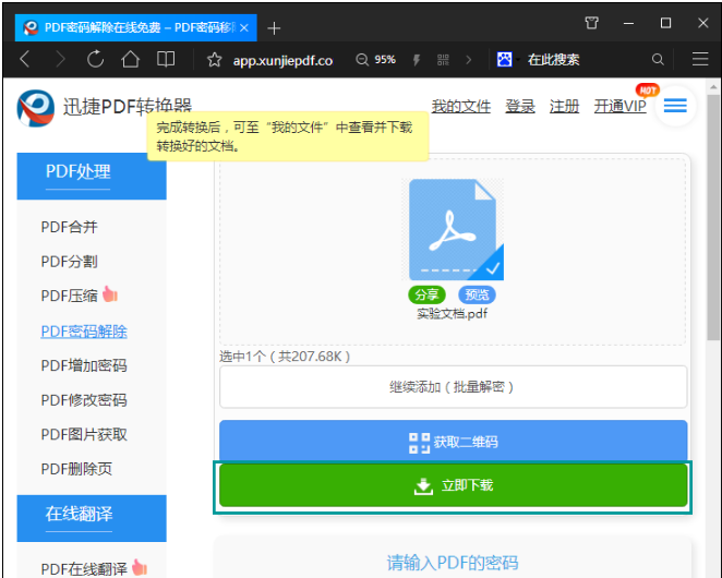 6、等到文件解密完成之后,我们点击“立即下载”就可以将处理好的PDF文件保存到电脑上。