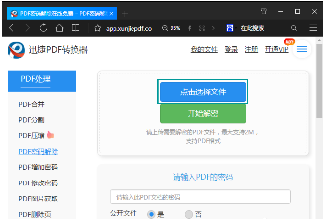 3、进入操作页面之后,我们点击“选择文件”就可以将加密的PDF文件打开了,如果需要解密的PDF文件比较多,可以批量上传文件。