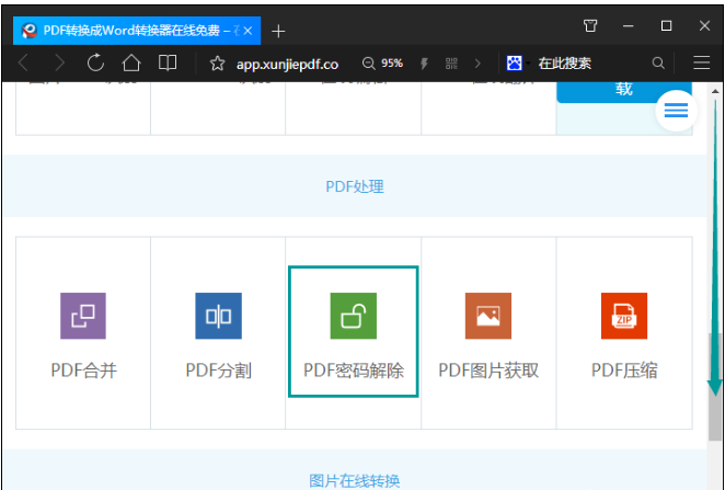 2、打开该站点的在线转换器页面之后,我们就可以点击下图中的“PDF密码解除”然后我们就可以进入操作页面。