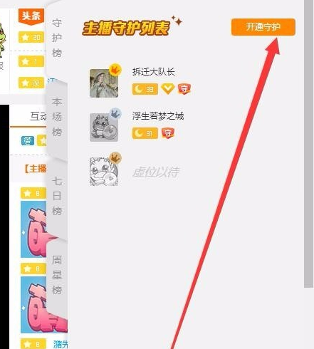 4、看到右上角有一个守护榜,点开会看到开通守护的按钮。