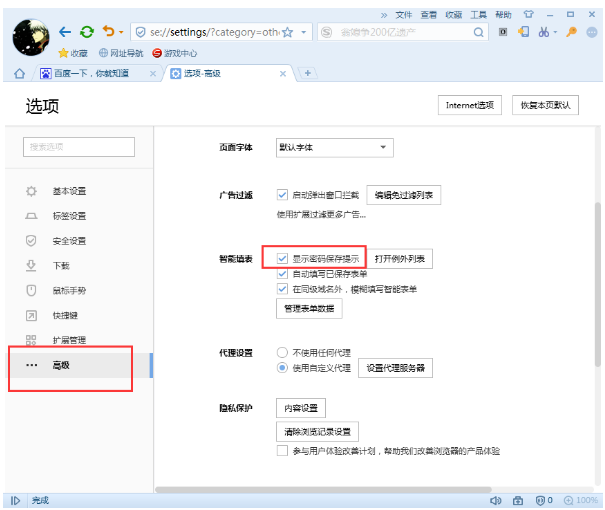 3、之后在选项界面的左边打开“高级”分类,然后在右边的“智能填表”中勾选上“显示密码保存提示”;