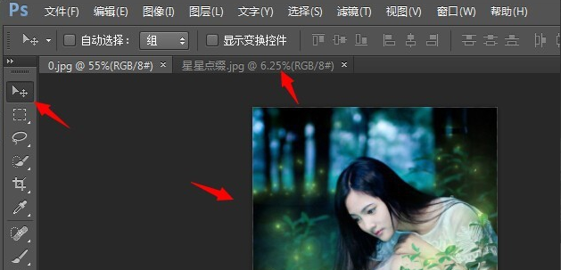3、选中工具栏中“移动工具”,将照片拖入背景图片中,如图所示。