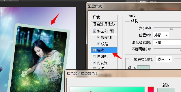 6、接着,打开图层的“图层样式”选项,勾选“描边”选项,将其边缘设置为合适的渐变颜色,如图所示。