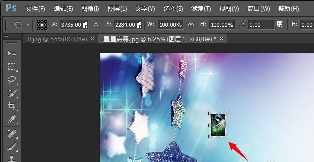 4、拖入以后,我们发现照片显得有些小,这时候,我们按键盘上“ctrl+T”键,即可以通过鼠标拖动调整照片大小了,如图所示。