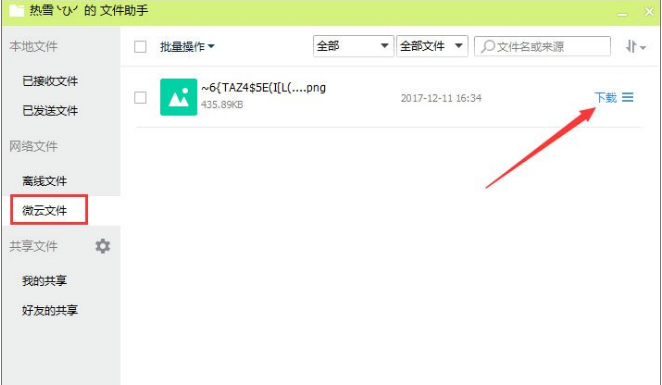 4、在文件助手里面左侧点击微云文件,我们可以找到这张传输未成功的图片文件。我们点击右边的“下载”;