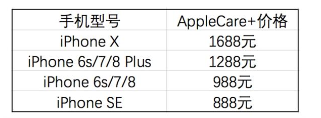 服务费用最贵的就是AppleCare+了,当然这也是服务最全面,最贴心的。目前在售的AppleCare+服务涵盖iPhone SE,iPhone6s一直到iPhone X系列,价格从888元到1688元不等。不过相比于iPhone X高达两三千元的屏幕维修费用,1688元购买一个保障也还不错。