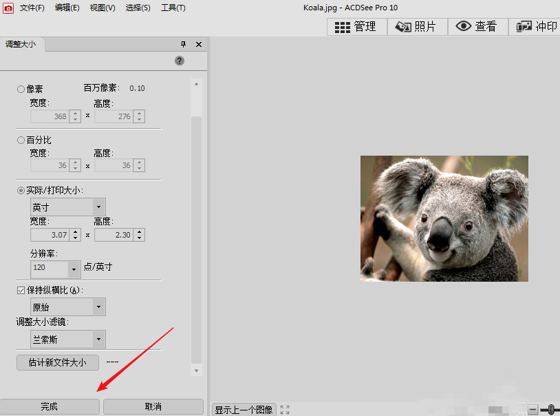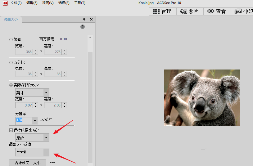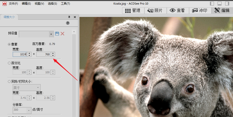 5、如果我们需要使用acdsee改图片分辨率,我们选择实际/打印大小,在里面就可以改图片的分辨率了,同时还可以改宽和高。