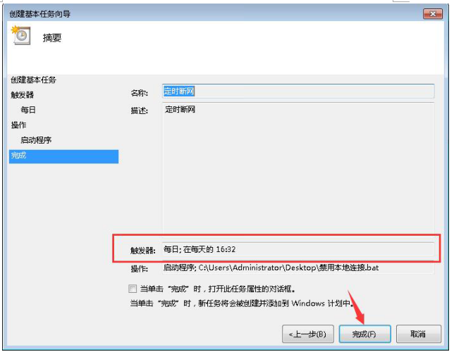 9、点击完成后电脑定时断网就设置完成了,这个原理就是设置在特定时间运行禁用本地连接脚本,禁用掉本地连接后就不能连上网了。