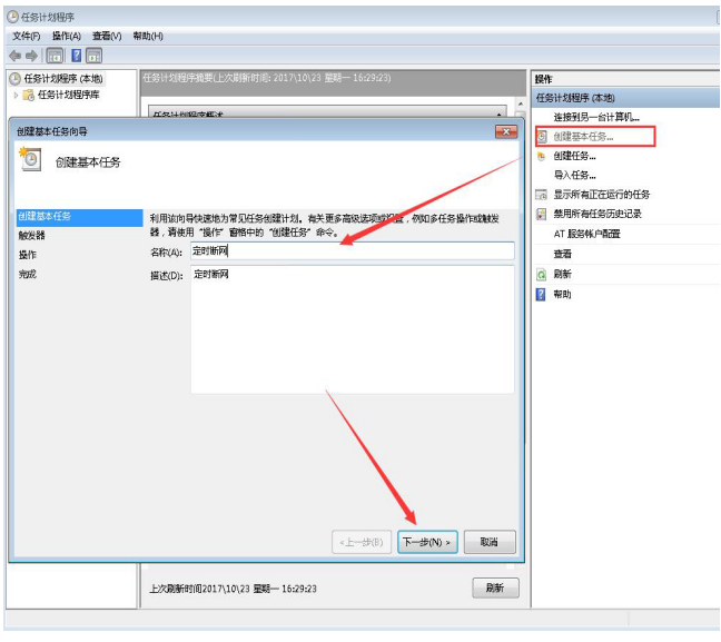 3、在打开的任务计划程序内点击“创建基本任务” 输入名称,点击下一步。