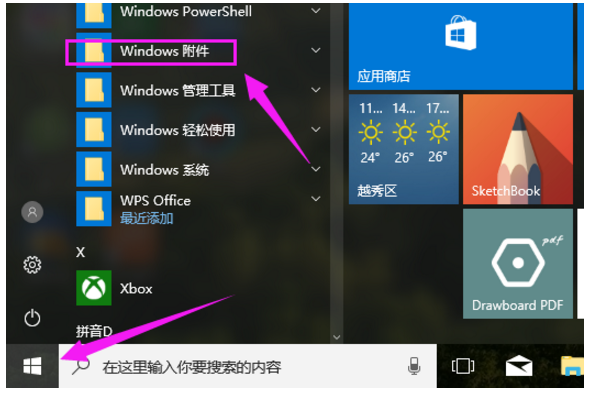 1、点击电脑“开始”图标,再点击“附件”。