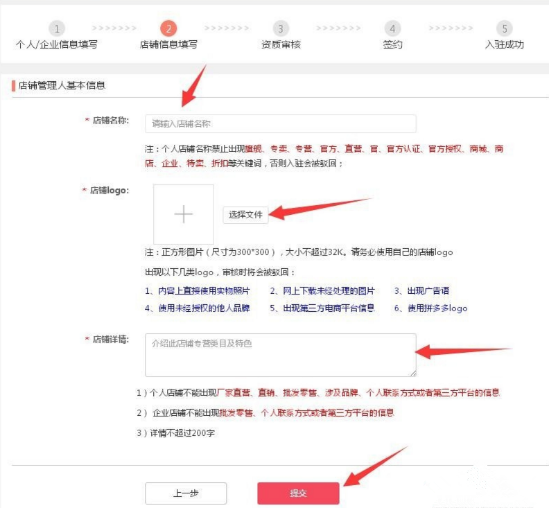 7、填写商户店铺资料,单击提交,等待资质审核过关,进行签约付保证金就入驻成功了。