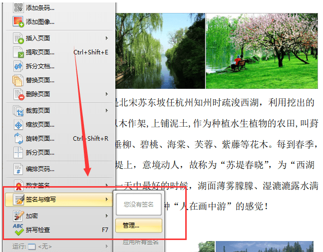 2、将PDF文件打开后,点击软件界面的“文档”选项,软件选择“签名与缩写”里的“管理”选项,进行签名添加操作。