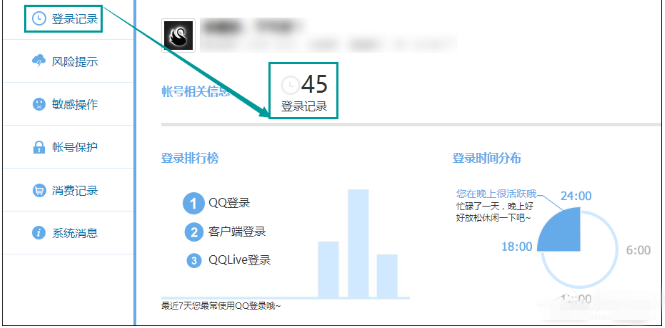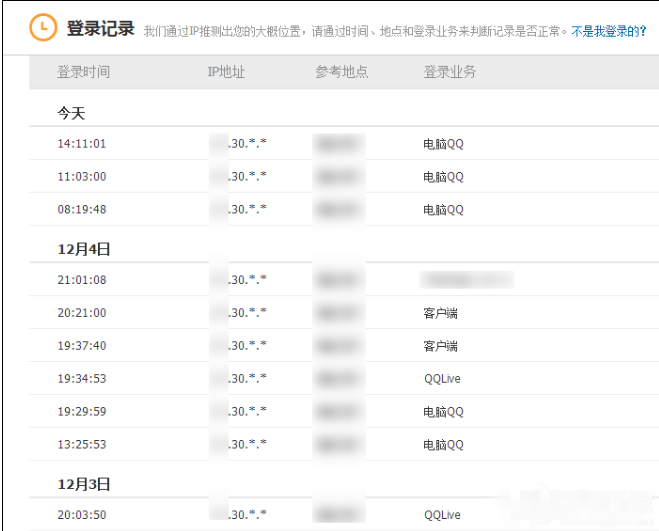 4、在这里可以查看近期的QQ登录记录,包括时间、ip地址、地点、登录业务等,假如出现异常的登录情况,那有可能出现被盗号的风险。