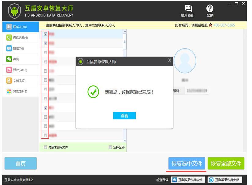 通过以上方法,即可成功恢复丢失的通讯录数据,若是需要恢复所有的电话通讯录,直接点击“恢复全部文件”就行了。