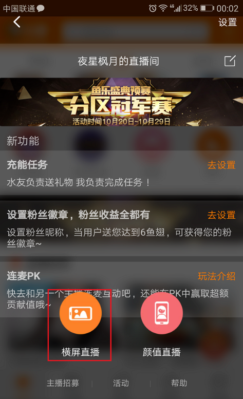 3、进去个人直播间之后,选择横屏直播还是颜值直播,如下图所示: