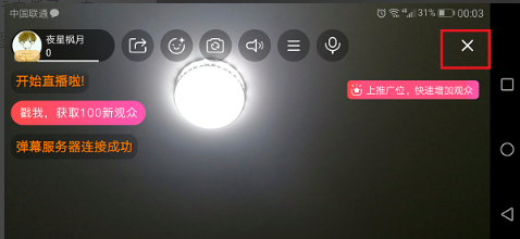 5、我们可以看到已经在进行直播了,直播完之后,点击右上方的关闭图标,如下图所示:
