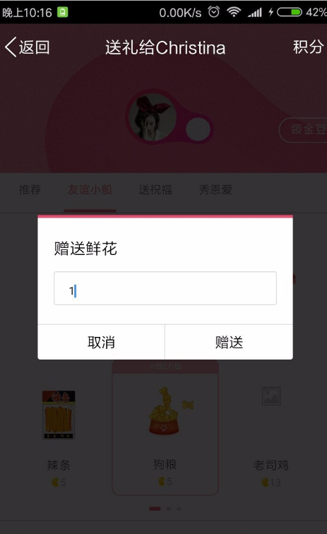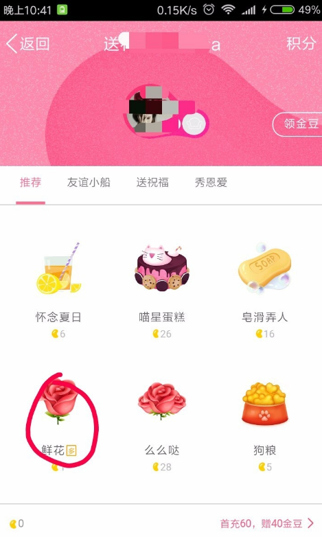 5、这里选择送鲜花为例,要用金豆来购买礼物,而金豆是花钱的哟。
