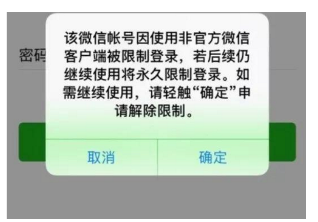 微信中心给出的封号理由是:该微信账号因使用非官方微信客户端被限制登录,若后续仍继续使用将永久限制登录。