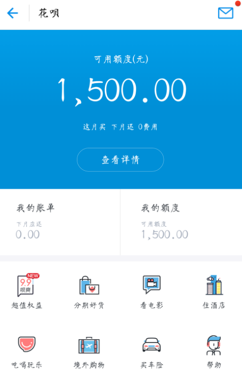 4、在花呗页面,“我的账单”这一选项是查看自己上个月的消费情况,“我的额度”是花呗的可用额度。