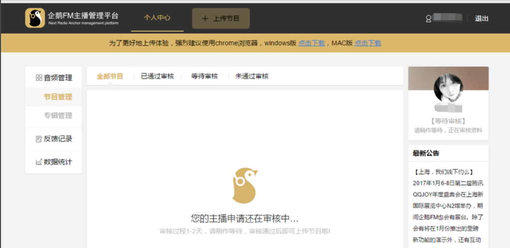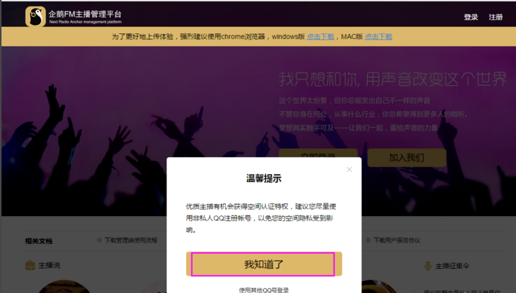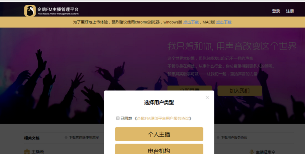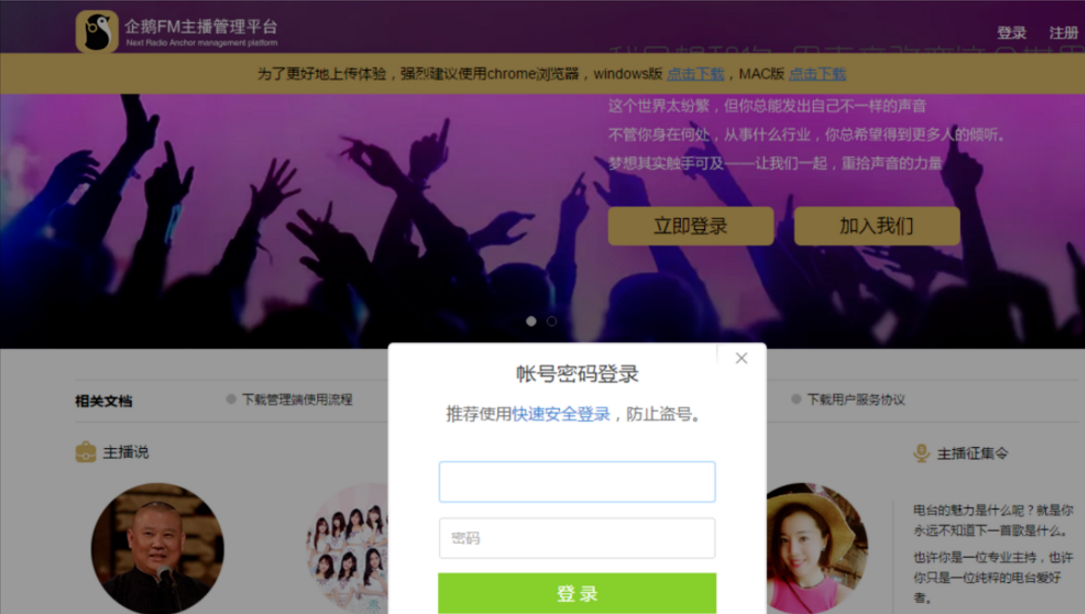 1、百度搜索企鹅FM官网,打开企鹅FM主播管理平台,点击“加入我们”(有部分浏览器无法上传作品,建议用chrome浏览器打开),