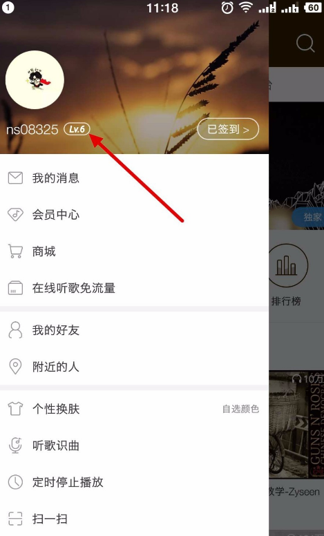 2、这时左侧就会弹出一个菜单,在上方头像下面旁边就会看到有一个“等级LV6”,我们点击它。