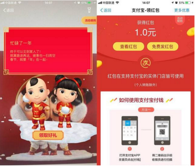 本次活动,支付宝启用了全新的AR Slam技术,扫描福娃后会伴随着音乐打开红包,同时可与福娃进行合影,扫福娃所领取的红包有效期为3天时间,该红包仅支持到店支付抵扣,不会与当前的其它扫码红包活动重叠,每天可领一次。