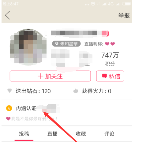 1、首先我们打开内涵段子APP,刷出一个认证用户,点击他的头像进入主页面。