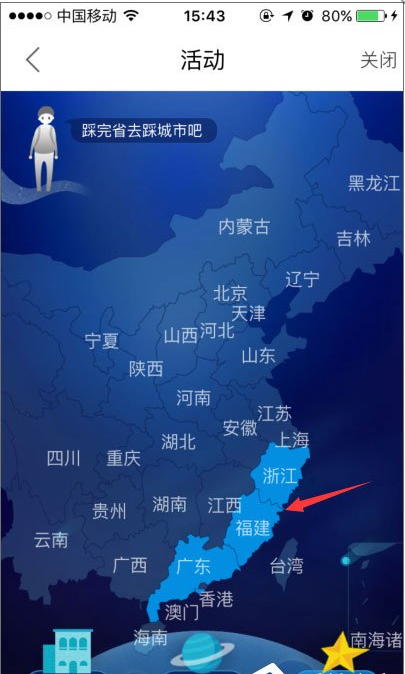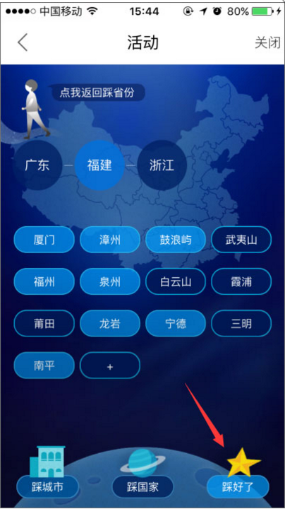 6、接着去踩城市,把自己到过的所有城市都点上,踩完后,点击右下角的“踩好了”;