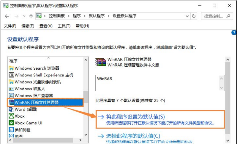 4、在左侧找到压缩软件后选中TA,然后点击右侧的“将此程序设置为默认值”。