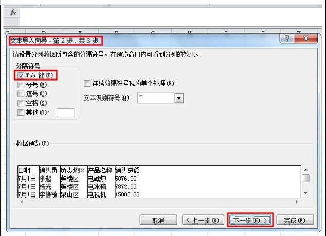 4、弹出“文本导入向导 - 第2步”对话框后,选择分隔符号下的“Tab键”,再点击下一步。