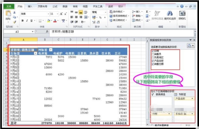 在工作表最右侧的“数据透视表字段列表”窗格上方,选中所需要的字段往下拖动到窗格下方的“行标签”和“列标签”等窗格 。Excel数据透视表会根据字段布局的不同,自动更新报表,选择不同的字段就可以进行不同维度的数据分析。