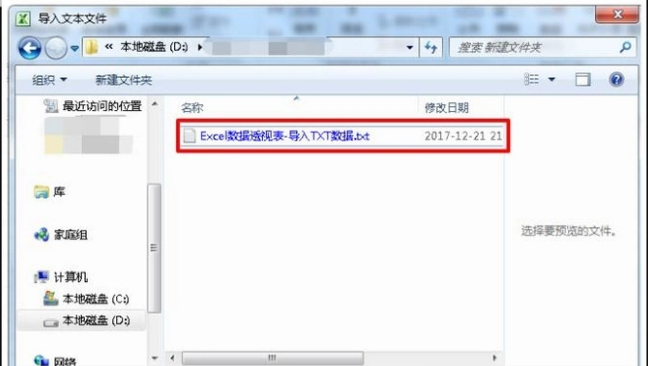 2、弹出“导入文本文件”对话框后,打开相应的路径,单击TXT文本文件,然后点击“导入”按钮(或者直接双击TXT文本文件)。