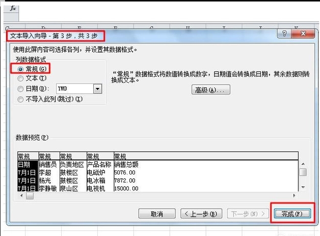 5、弹出“文本导入向导 - 第3步”对话框后,选择列数据格式底下的“常规”,再点击完成。