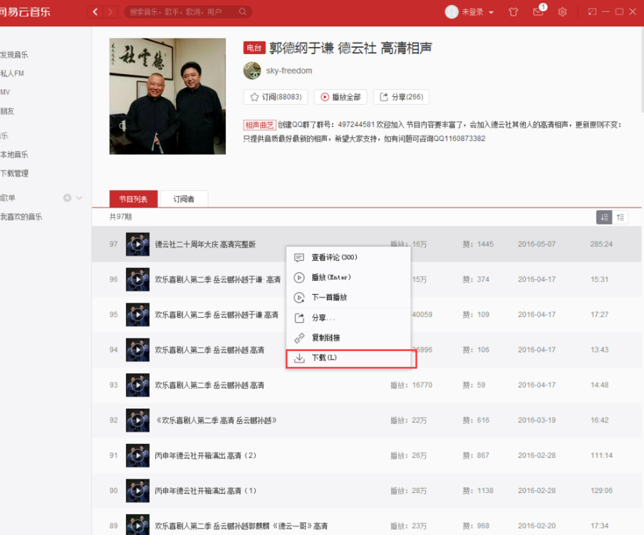 4、如果很喜欢听某个相声,可以进行下载,右键点击选择的条目进行下载,如图。