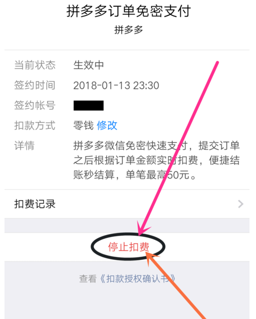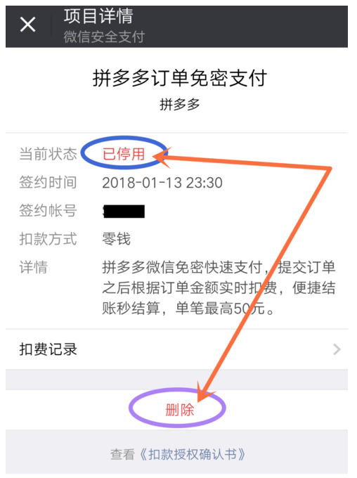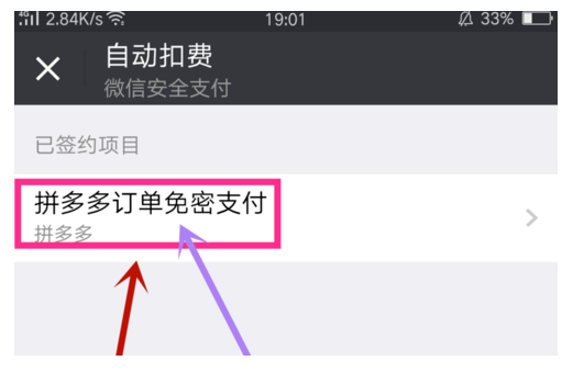 5、在自动扣费中,可以查看自己的微信支付签约的扣费项目,点击进入项目“拼多多订单免密支付”,如图所示,