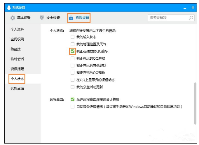 2、在系统设置界面中,点击“权限设置→个人状态”,然后取消勾选“我正在播放的QQ音乐”,如图所示: